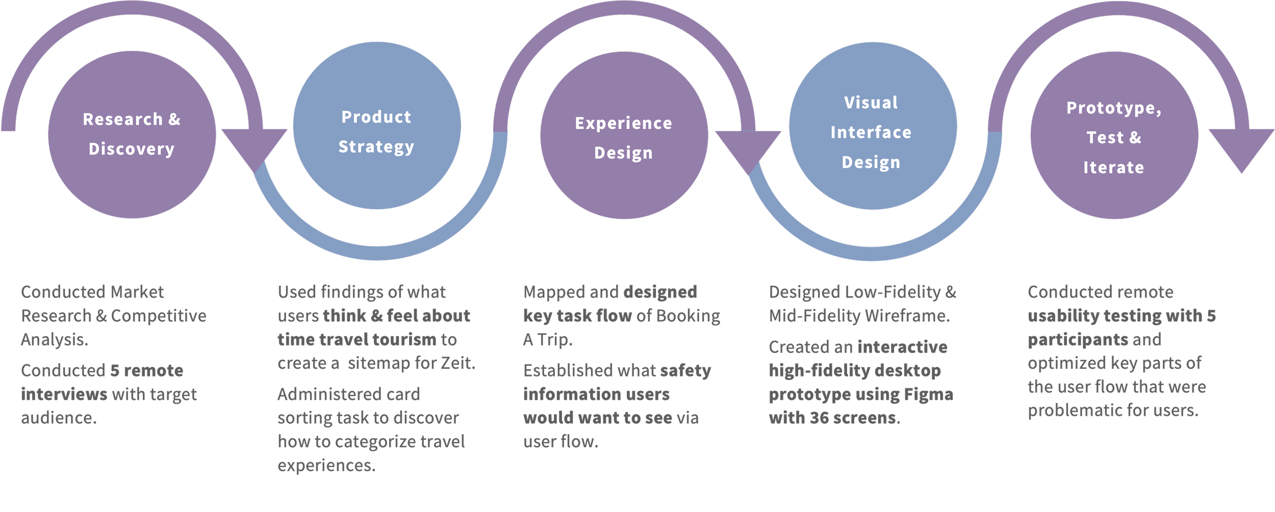 I planned and conducted 5 remote interviews with participants to determine how users think when it comes to planning, researching, and booking travel experiences and to learn more about their thoughts and concerns regarding the concept of time travel. Participants were recruited to match Zeit’s target audience.