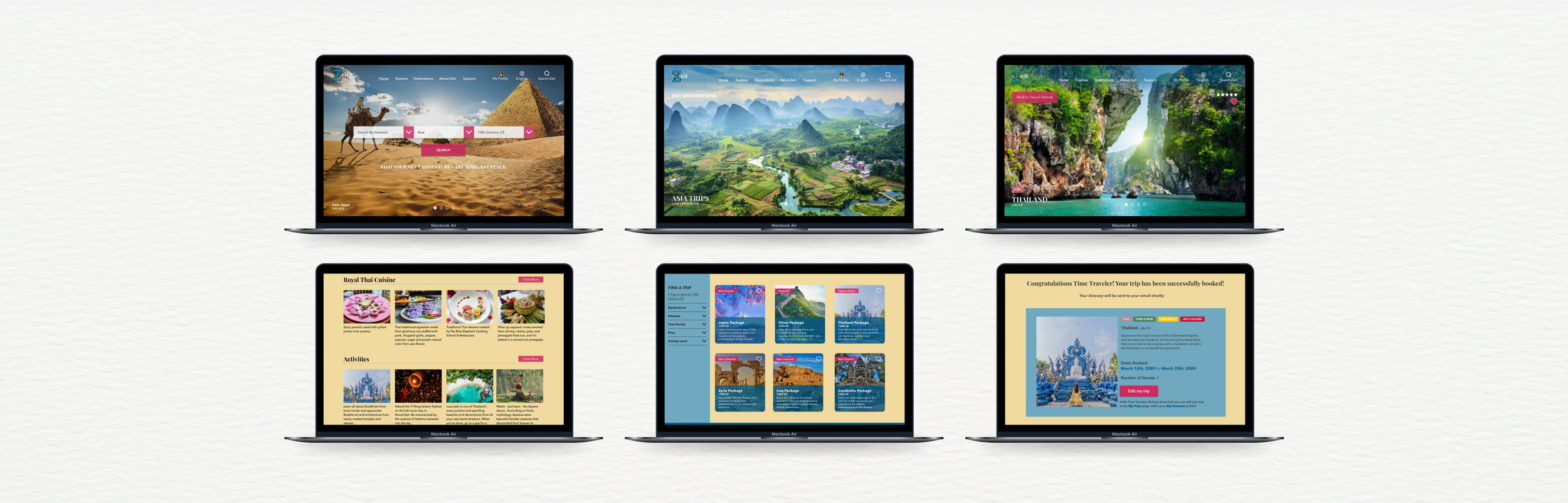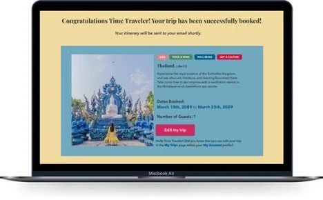 A Home page, Asia Destinations page, Thailand Destination page, and Book A Trip page were designed to show how users like Isabel would learn about time travel technology and pick and Book A Trip.